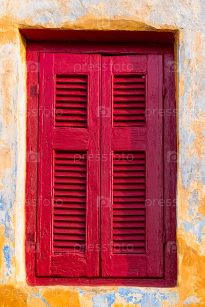 Старые средиземноморские красные ставни и фон стены