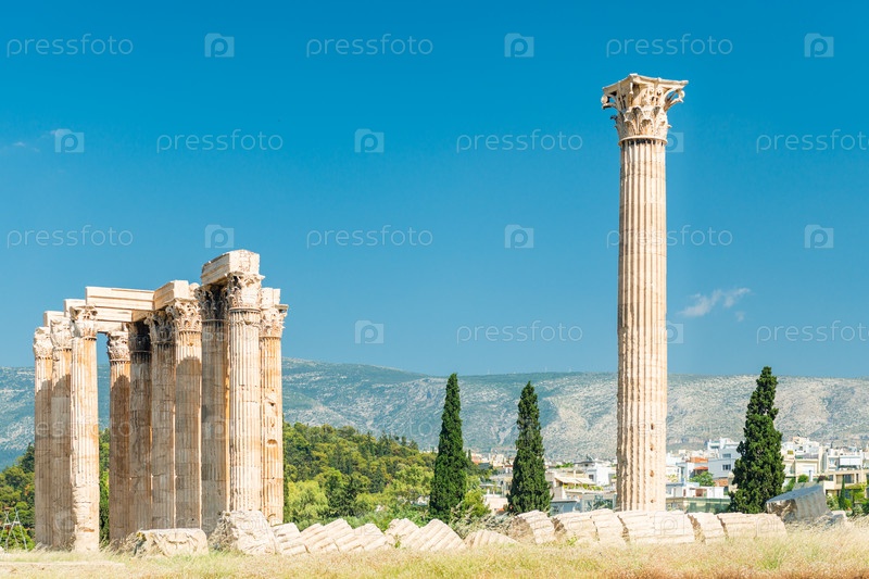 Греческий олимпийский храм Зевса, пейзаж с древними руинами в Афинах, Греция