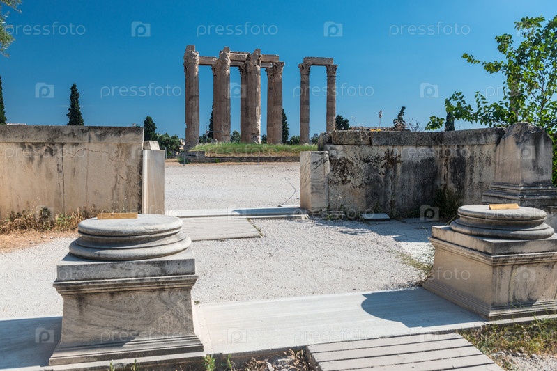 Греческий олимпийский храм Зевса, пейзаж с древними руинами в Афинах, Греция