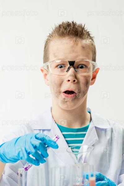 Забавный мальчик в костюме химика с грязным лицом после неудачного эксперимента