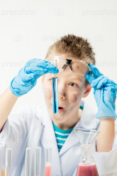 Забавный мальчик в костюме химика с грязным лицом после неудачного эксперимента