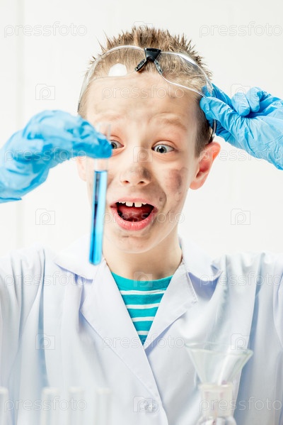 Забавный мальчик в костюме химика с грязным лицом после неудачного эксперимента