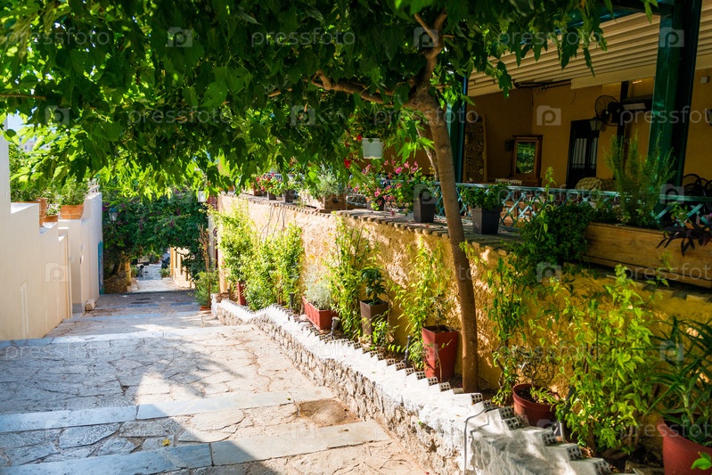 Старая узкая улица в Анафиотике, район Плака, Афины, Греция
