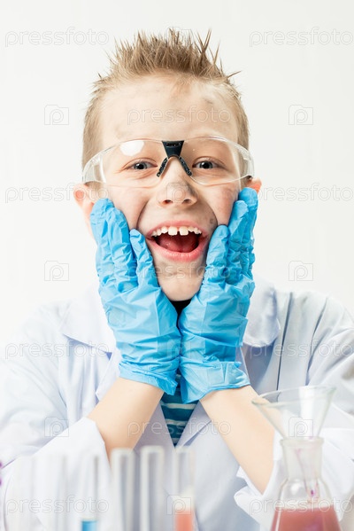 Забавный мальчик в костюме химика с грязным лицом после неудачного эксперимента