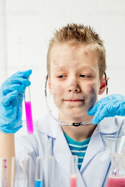 Забавный мальчик в костюме химика с грязным лицом после неудачного эксперимента