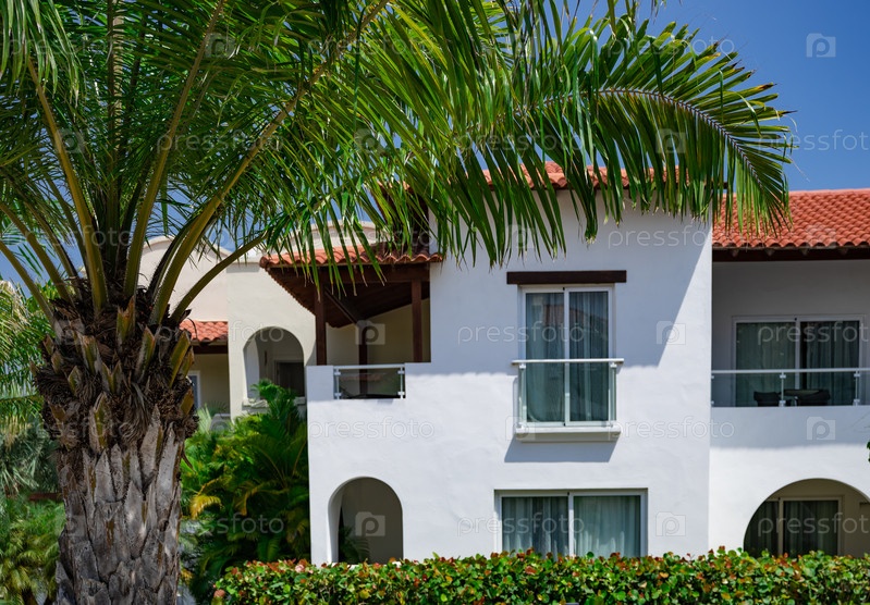 Отель с красной черепицей в зеленых листьях