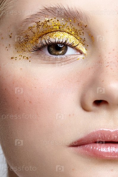 Макросъемка крупным планом человеческого женского лица с желтым дымчатым макияжем глаз