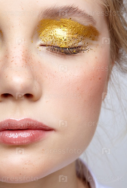 Макросъемка крупным планом человеческого женского лица с желтым дымчатым макияжем глаз