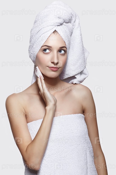 Молодая женщина с банным полотенцем на голове и косметической подушечкой в руке
