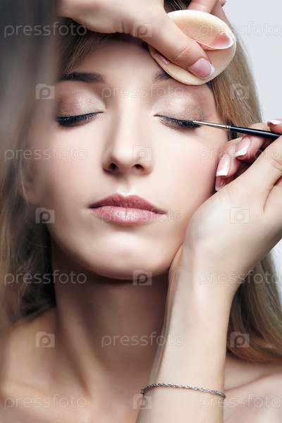 Женский стилист - визажист делает макияж глаз молодой женщине