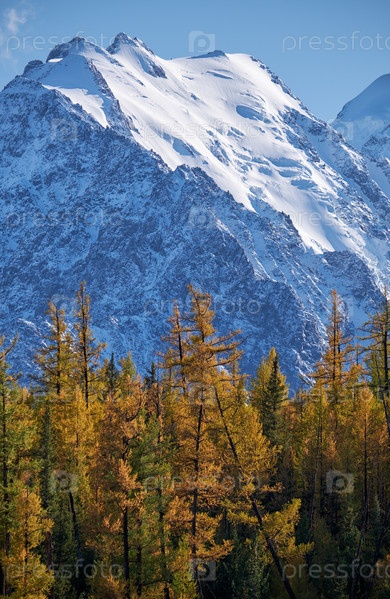 На переднем плане Северо-Чуйский горный массив с лиственничным лесом. . Алтай, Россия