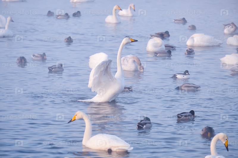 Cygnus cygnus - лебедь-кликун летает на озере Алтай