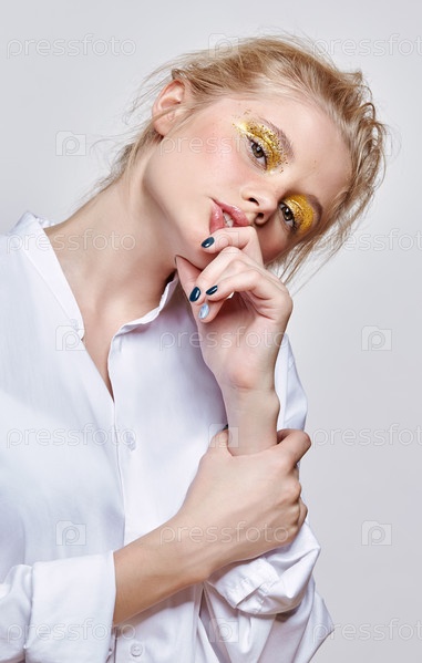 Портрет молодой блондинки на сером фоне