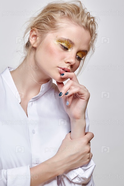 Портрет молодой блондинки на сером фоне