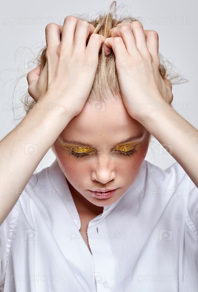 Женщина с необычным блестящим блестящим модным макияжем лица. Девушка с желтыми дымчатыми тенями для глаз и руками на голове
