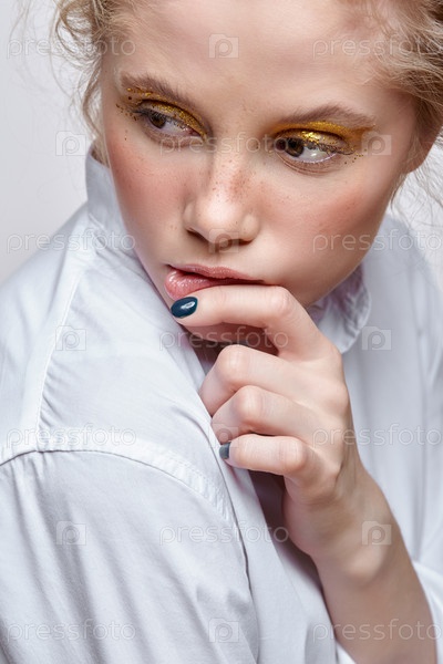 Портрет молодой блондинки на сером фоне