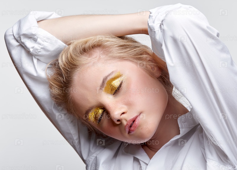 Портрет молодой блондинки с закрытыми глазами на сером фоне