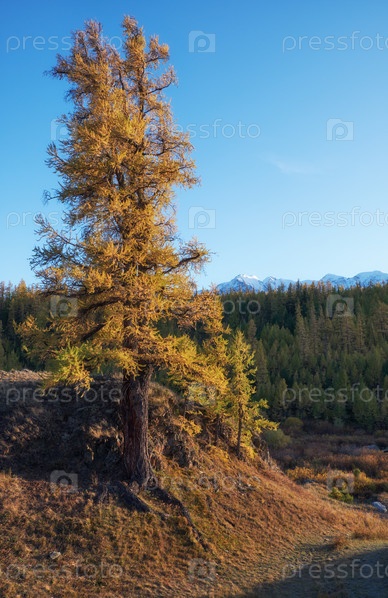 Лиственница с камнями на переднем плане, лиственничный лес и снежные горы на заднем плане. Осень