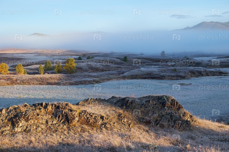 Алтайская река Куркурек на плато Эштыкель покрыта утренним туманом. Трава под инеем