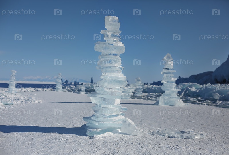 Кусочки льда, лежащие на идеально гладком льду байкала с ледяными торосами на горизонте