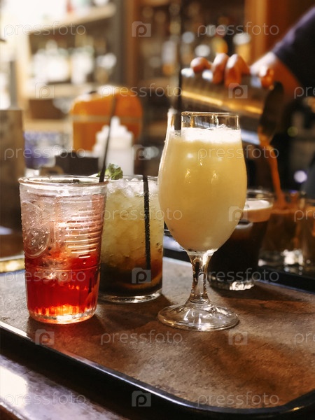 Различные коктейли на подносе в баре