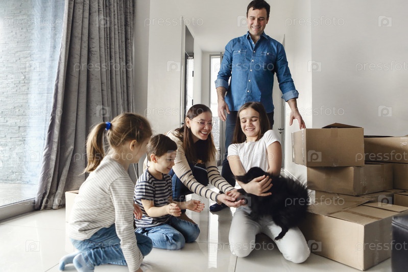 Счастливая семья сидит на полу в гостиной. Смешные дети с маленькой собачкой у картонных коробок, родители смеются