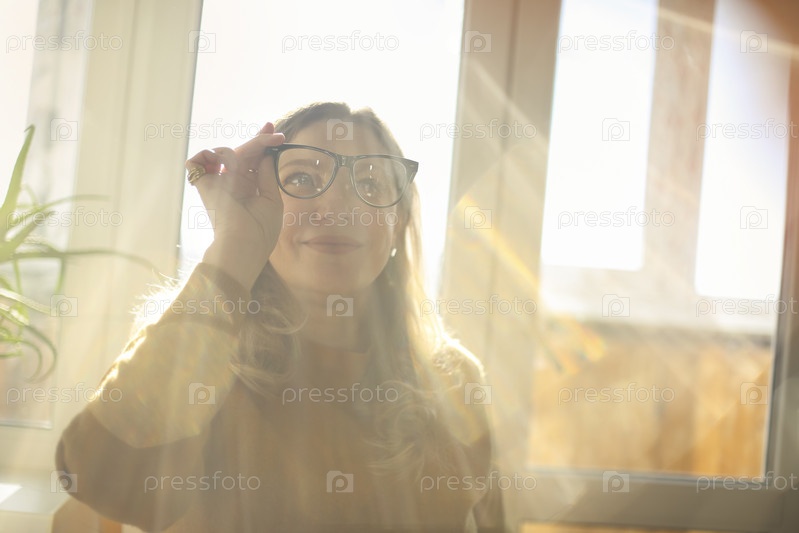 Счастливая блондинка средних лет, держащая очки, сидя в комнате с солнцем, падающим в окно
