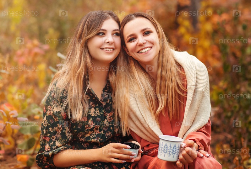 Молодые женщины пьют горячий напиток в осеннем лесу