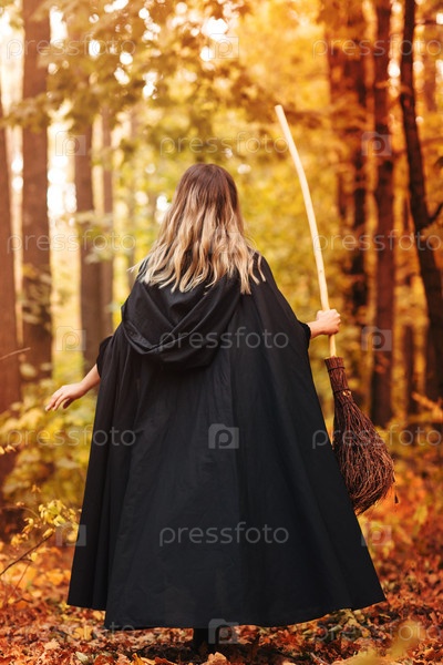 Вид сзади анонимной женщины в костюме ведьмы с метлой, идущей по тропе, покрытой осенними листьями, в день Хэллоуина в лесу