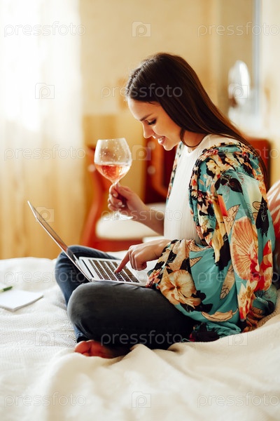 Беззаботная женщина, использующая ноутбук и пьющая вино