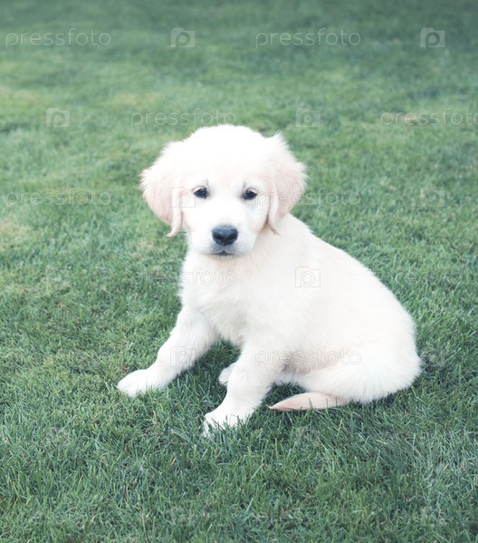 Милый бежевый щенок на зеленой траве