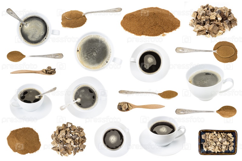 Набор различных корней цикория и напитков изолированы