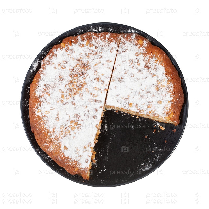 Вид сверху на нарезанный итальянский пирог с кедровыми орешками на тарелке