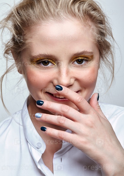 Улыбающееся женское лицо с необычным блестящим модным макияжем лица