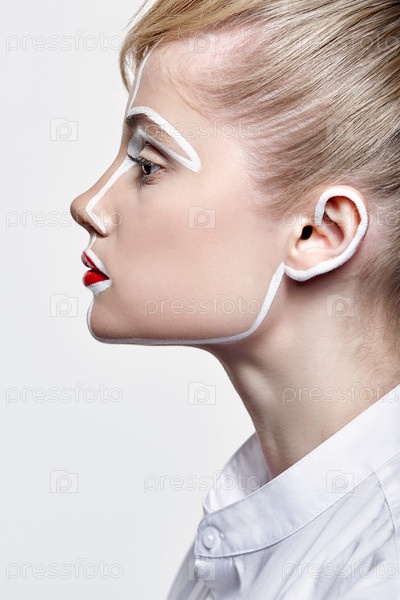 Вид сбоку красивой молодой женщины. Женщина с необычным творческим макияжем на лице