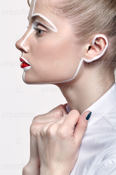 Вид сбоку красивой молодой женщины. Женщина с необычным творческим макияжем на лице