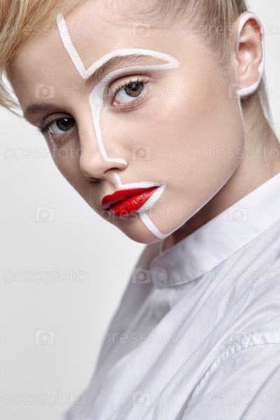 Вид сбоку красивой молодой женщины. Женщина с необычным творческим макияжем на лице