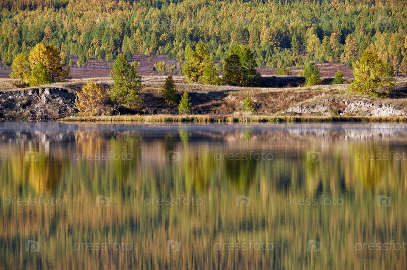 Отражение осеннего леса с лиственницей сибирской в воде горного озера Джангыскол на плато Эштыке. Альта
