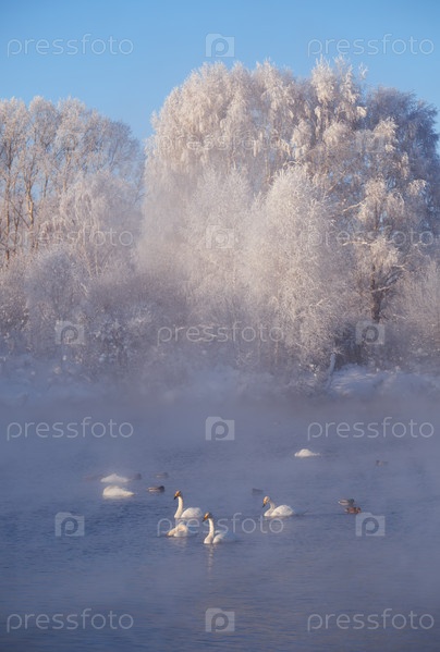 Лебеди и утки в тумане на алтайском озере Светлое