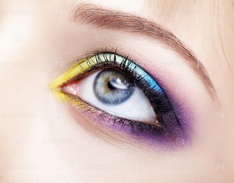 Макроизображение крупным планом человеческого женского глаза с фиолетовым, синим и желтым макияжем