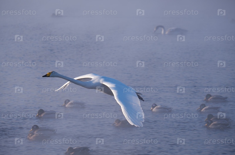 Лебеди летают в тумане на алтайском озере Светлое
