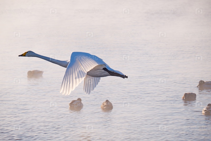 Лебеди летают в тумане на алтайском озере Светлое