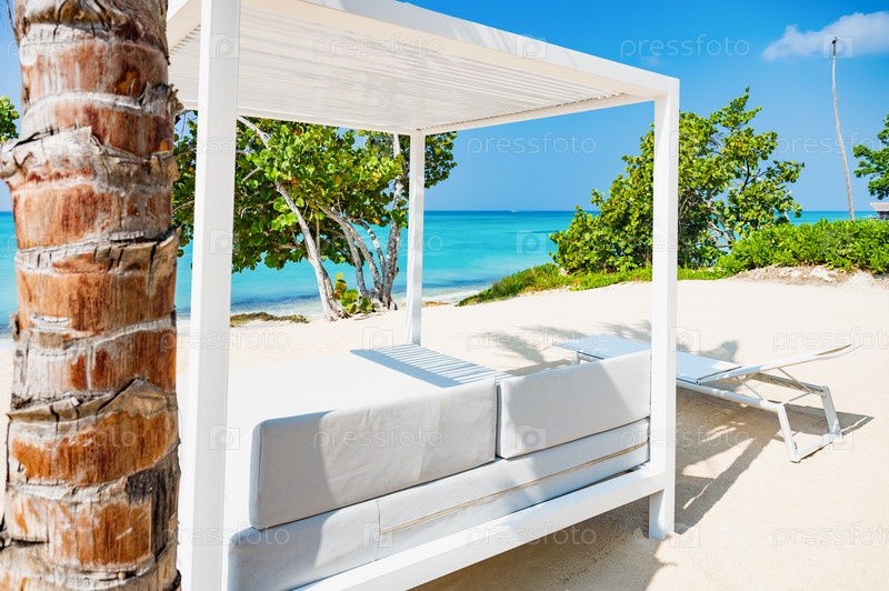Белая кровать на песчаном пляже моря