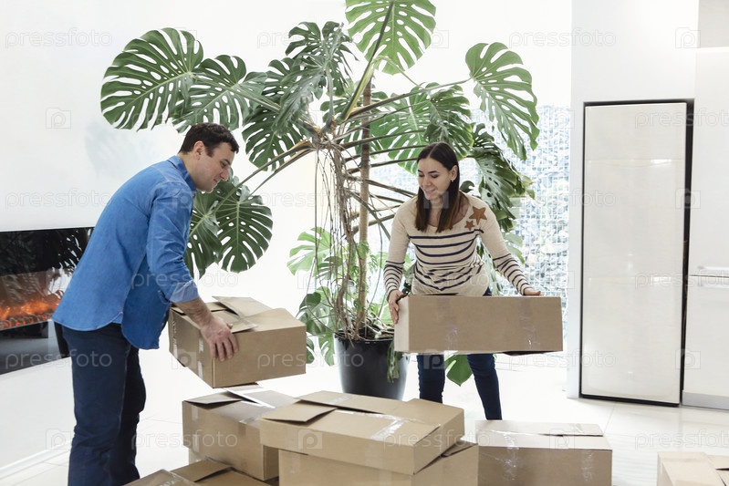 Счастливая пара с картонными коробками в новом доме. Женщина с ключами