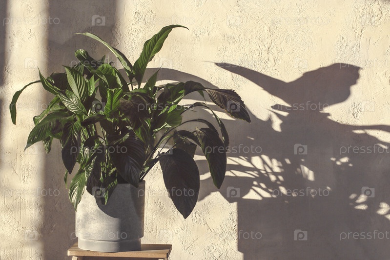 Уход за растениями. Зеленое комнатное растение спатифиллум или мирная лилия под солнечным светом на фоне серой бетонной стены