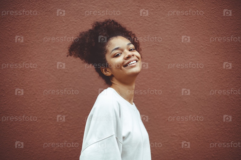 Настоящее счастье. Милая счастливая африканская американка с кудрявой прической в белом свитере позирует у коричневой стены