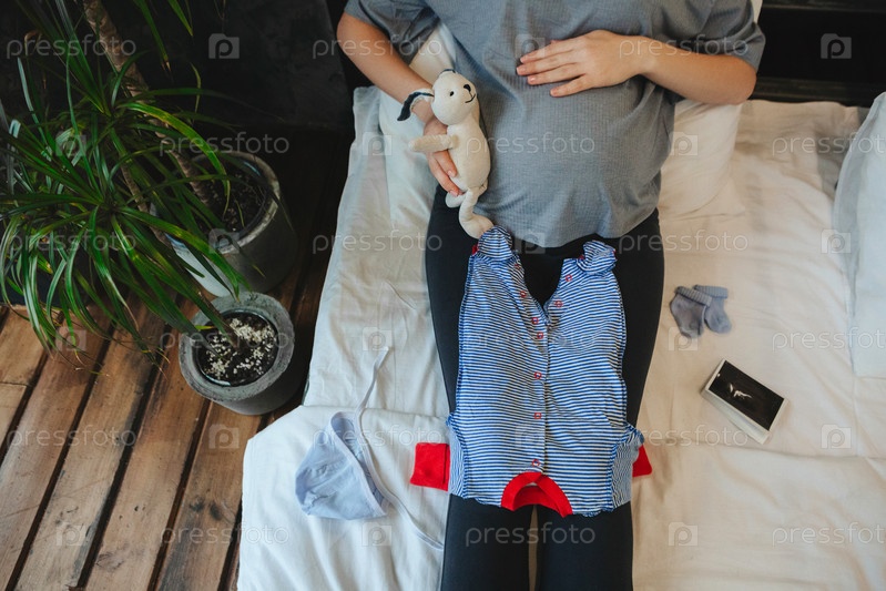 Беременная женщина смотрит на очаровательную одежду для новорожденных, отдыхая дома, готовясь к родам