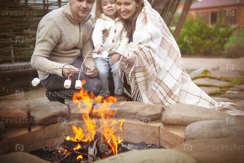 Счастливая семья готовит зефир на гриле во внутреннем дворике