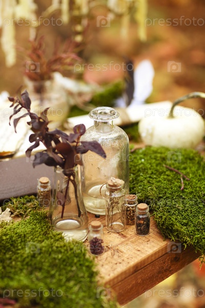 Бутылки и растения на столе