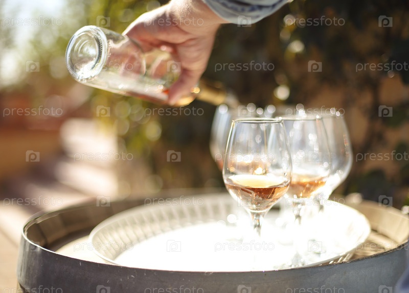 Много стаканов и бутылка розового вина в осеннем винограднике